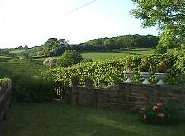 a similar view but taken from the bench at the front of the cottage where I spend my afternoons, the hill runs the other side of the wall with the tubs on and in front of the hedge |